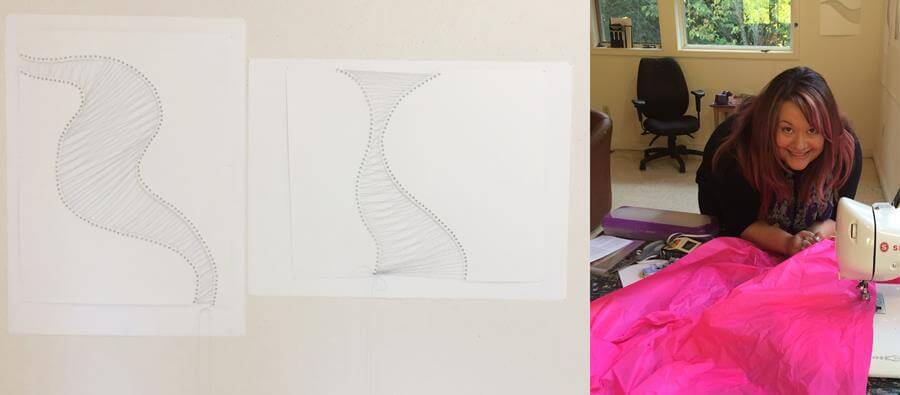 Visual artist Beth Giacummo, known for her site-specific, interactive, inflatable sculptures, came to Saltonstall ready to experiment with some new ideas. “I’m calling them grommet drawings,” she says, referring to half-a-dozen works on paper tacked to her bulletin board (seen above on the left.) Paper is bisected with organic shapes, lined with tiny grommets, and then fastened with a metallic silver thread or ribbon. “I’ve never done these before,” says Beth. “I never have the time to just make drawings and the studio space to spread them all out and see how they look on their own or as a collection. I’m really excited about them.”
