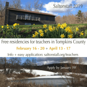 You may be thinking, “But.. Is this for me?“ If you are a teacher, working in a public school in Tompkins County than this is for you. This is not a juried residency. It is open to artists and writers of all stripes. Are you a chemistry teacher with a passion for writing or photography? An art teacher who longs for time to devote to their own work? A math teacher who is secretly working on a memoir? YES, this is for YOU! Space is limited and based on lottery. Apply here! Applications are due by 11:59pm this Saturday, January 19.