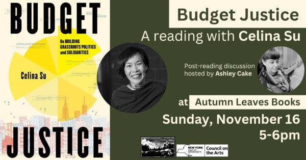 Join us in downtown Ithaca as we host Celina Su for a reading of her recently published book, Budget Justice: On Building Grassroots Politics and Solidarities. (Princeton University Press)