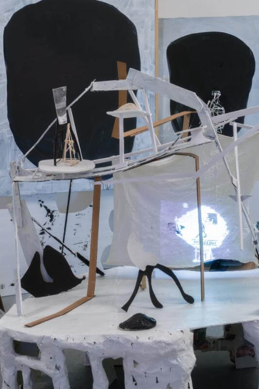 Patte’s work in the upcoming show (seen here) uses scavenged material, cardboard, putty, cloth, digital projector, and a DVD player.