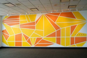 Left: Deborah Zlotsky, “Flight Patterns,Yellow and Orange”, 2019. Latex paint on white wall. ( inspired by paper planes!)